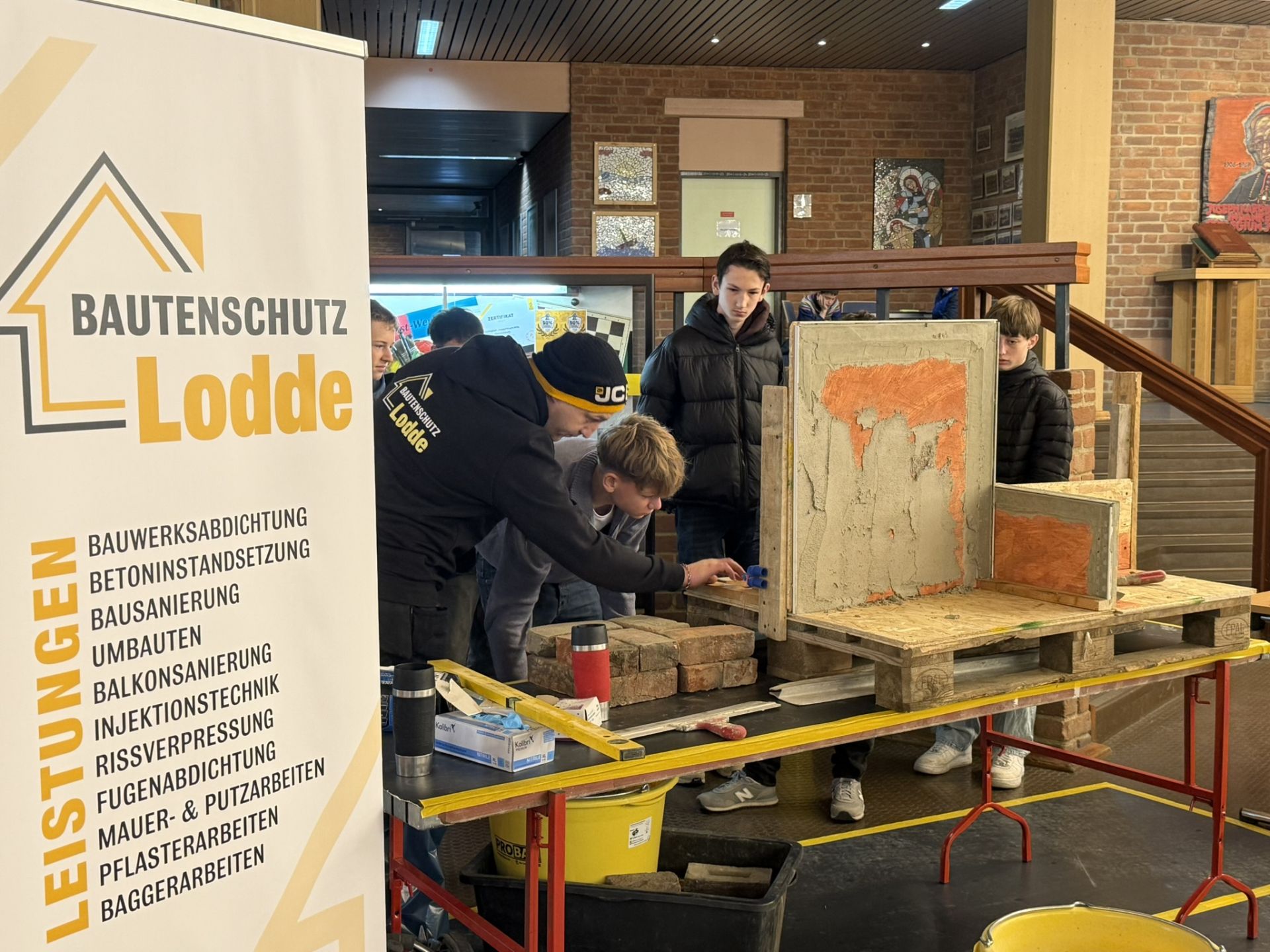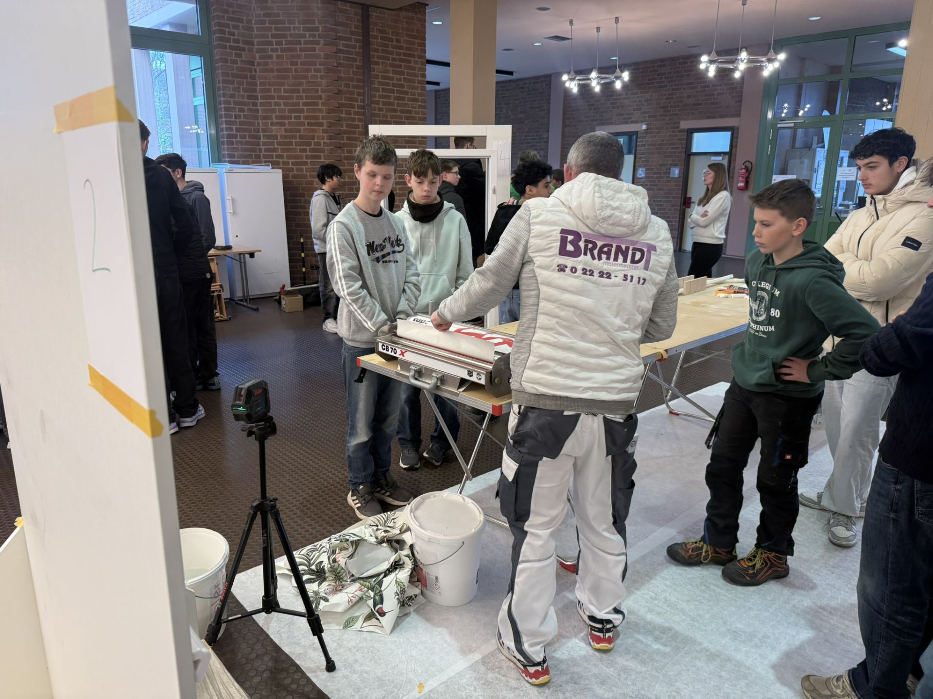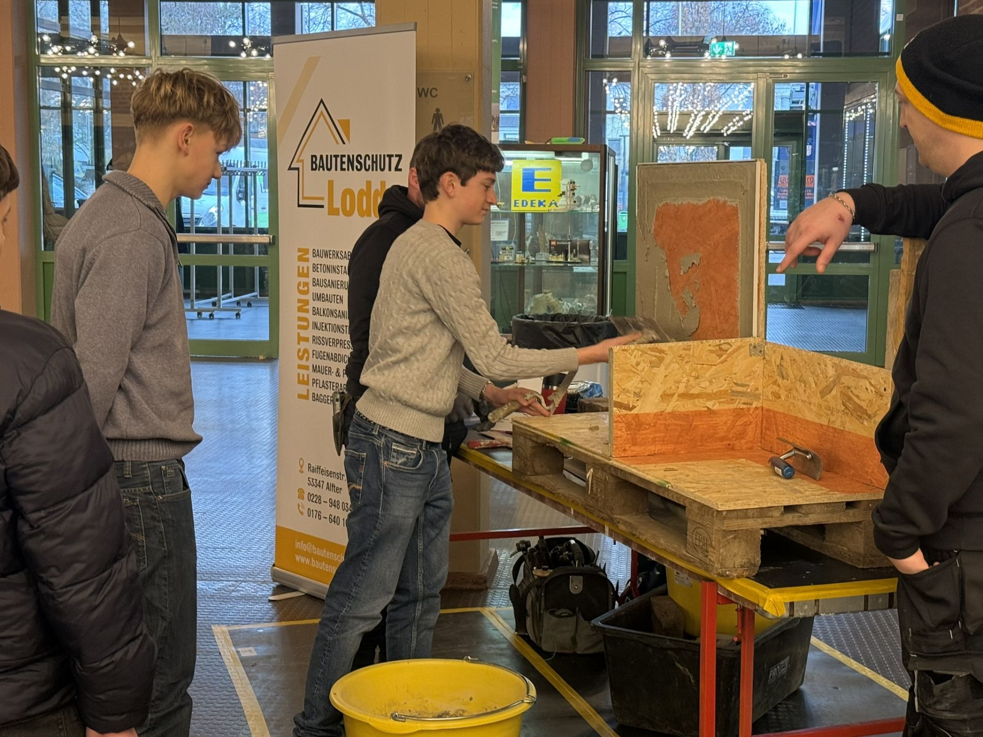 Bei unserer Handwerkermesse in der Aula wird es praktisch: Schülerinnen und Schüler der Klassen 8 und 9 können selbst mit anpacken und echte Berufsluft schnuppern. Ob tapezieren, sägen, Fliesen legen, Wände verputzen, Fenster einbauen oder Gerüste inspizieren – hier ist Ausprobieren ausdrücklich erwünscht. Auch die Arbeit mit Metall gehört dazu.