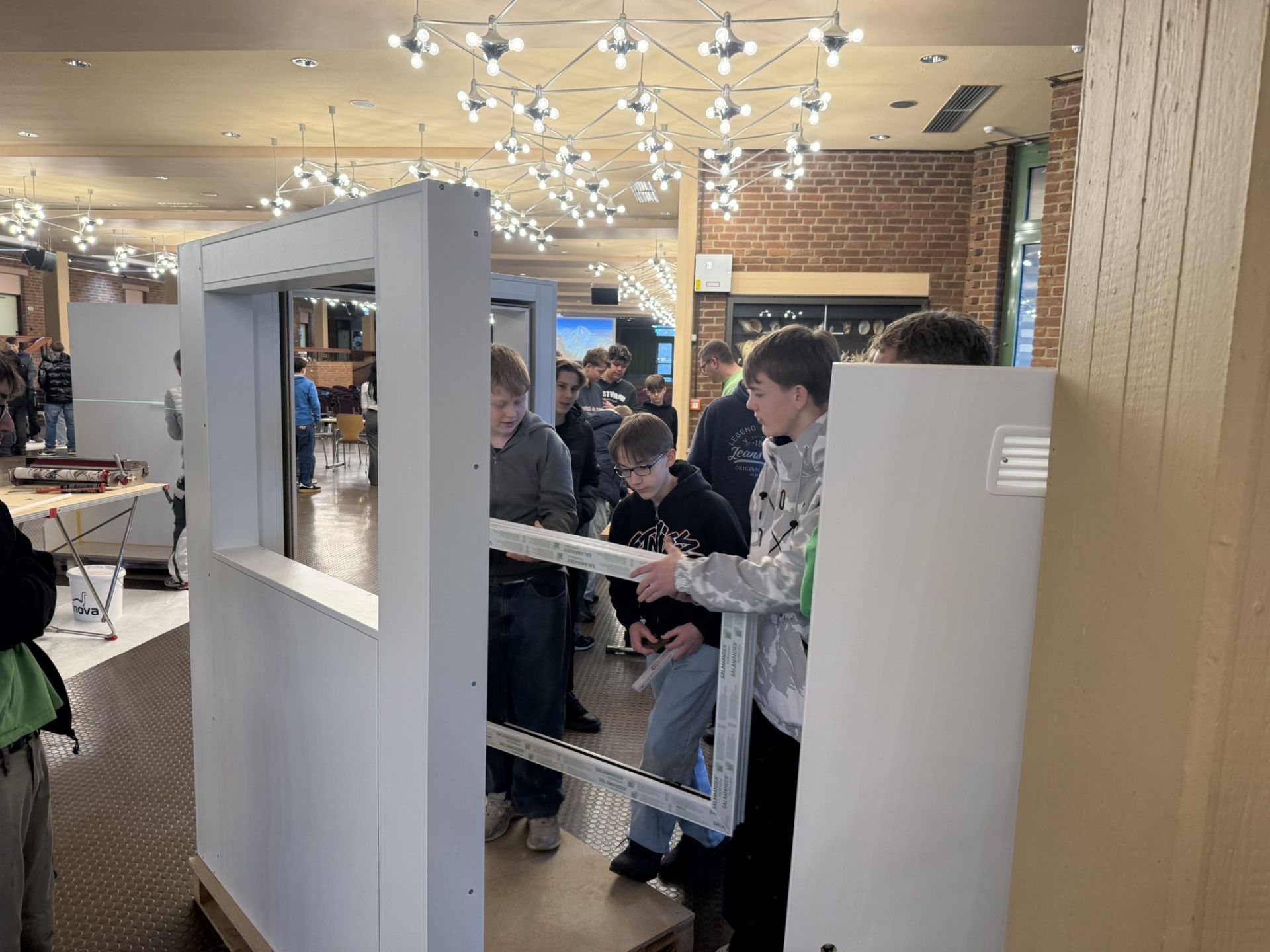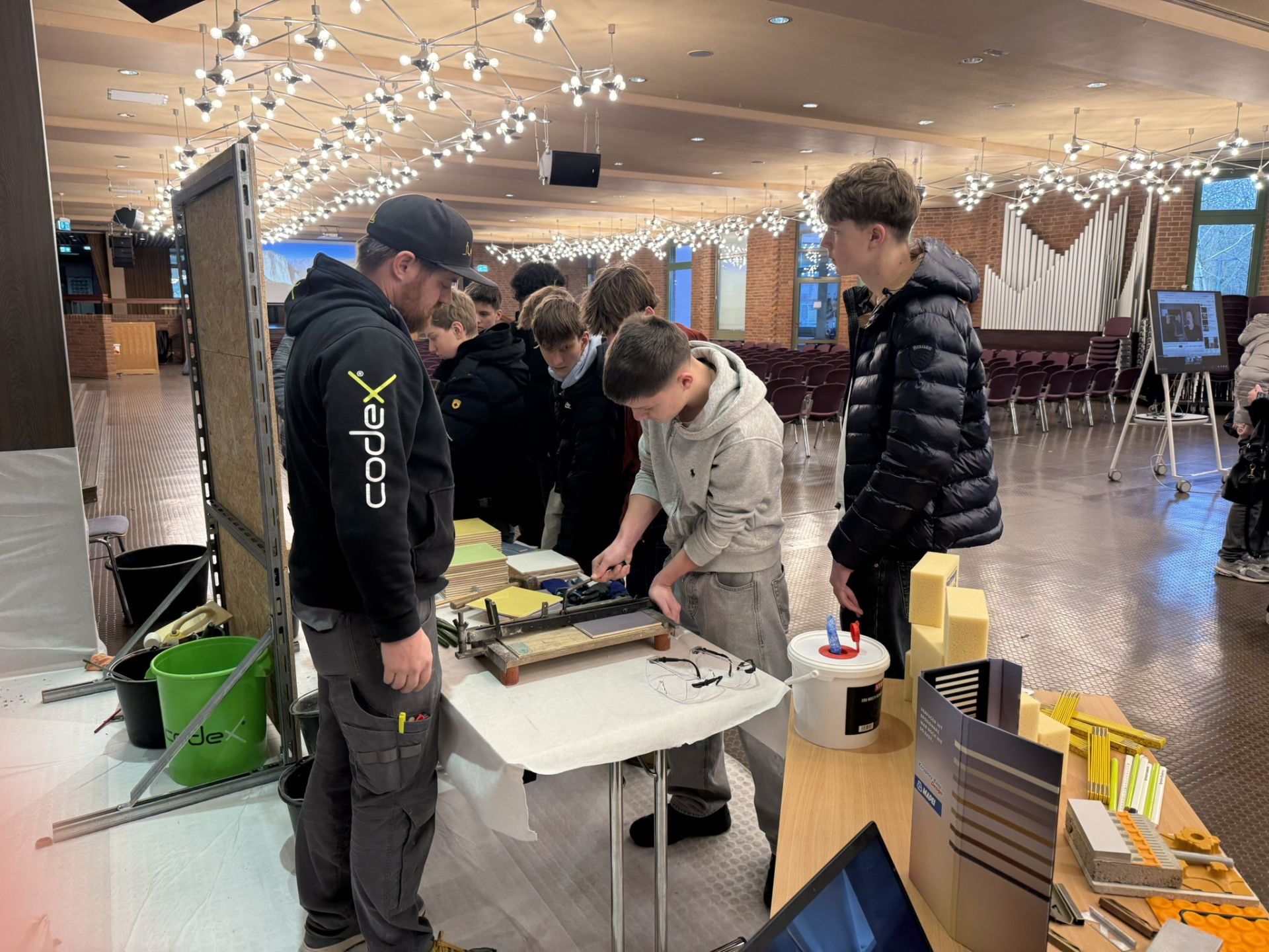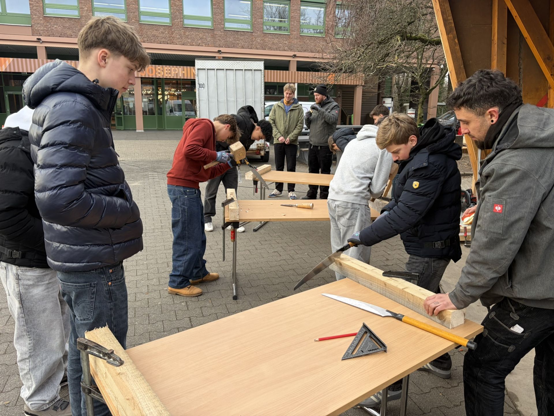Bei unserer Handwerkermesse in der Aula wird es praktisch: Schülerinnen und Schüler der Klassen 8 und 9 können selbst mit anpacken und echte Berufsluft schnuppern. Ob tapezieren, sägen, Fliesen legen, Wände verputzen, Fenster einbauen oder Gerüste inspizieren – hier ist Ausprobieren ausdrücklich erwünscht. Auch die Arbeit mit Metall gehört dazu.