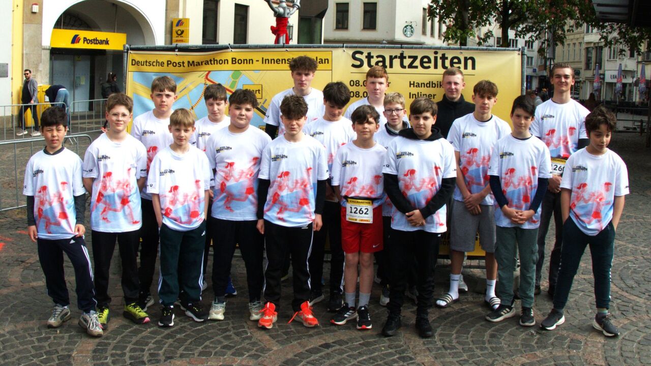 Wie in den vergangenen Jahren hat die Realschule wieder mit drei Staffeln am Bonner Schulmarathon teilgenommen. Dabei haben alle von Hans-Peter Anders betreuten Staffeln die Strecke von 42,195 Kilometern bewältigt und das Ziel erreicht. Die erste Staffel hat mit einer Zeit von 3:52:18 Stunden die Schallmauer von 4 Stunden durchbrochen und belegte den 95 Platz. Das reichte in der Altersklasse zu Platz 21. Auch die 2. Und 3. Staffel können mit ihren Leistungen sehr zufrieden sein, da hier viele Schüler eingesetzt waren, die entweder zum ersten Mal an einem solchen Event teilnahmen oder längere Strecken als gewohnt liefen. Die zweite Staffel belegte in 4:16:44 Stunden den 187 Platz von allen und den 41. Inder Altersklasse. Die 3. Staffel kam nach 4:343:22 Stunden im Ziel an und konnte sich über Platz 222 beziehungsweise Platz 45 in der Altersklasse freuen. (Hans-Peter Anders)