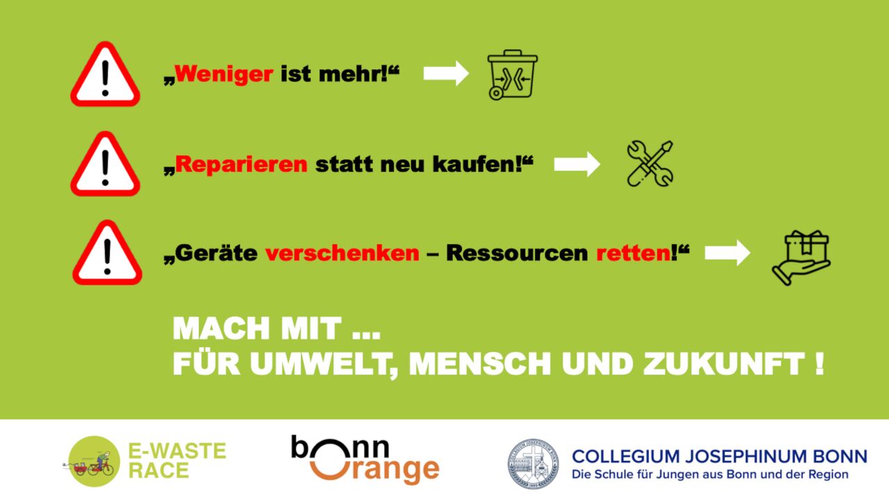 Seit über zwei Wochen nimmt die Klasse G7b unserer Schule mit großem Engagement an der E-Waste Race teil – einem spannenden Umweltprojekt, bei dem 8 Bonner Schulen in einem freundschaftlichen Wettbewerb möglichst viel alten Elektroschrott sammeln.